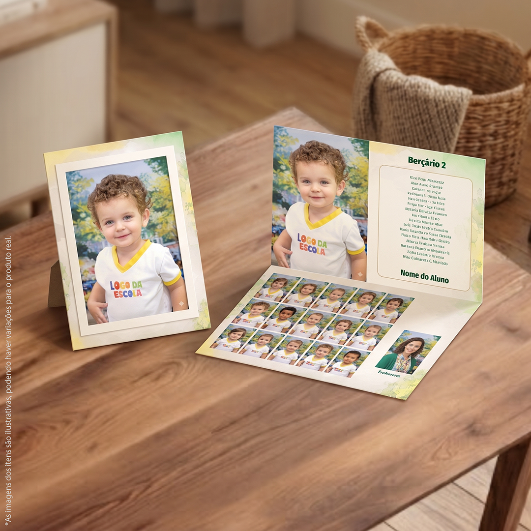 1 – Anuário 2 – Fotoímãs 1 – Cartela de Adesivos 5 – Fotos 3×4 3 – Fotos 5×7 1 – Foto 13×18 com porta retrato temático